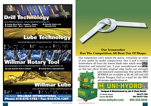 Our competitors can’ t match the power, versatility or value of any model by model comparisons. Our 3 and 4 station Ironworkers all have the lowest blade rake which minimizes distortion and material loss. 3 year unconditional warranty on flat bar shear blades original edge backs our strength and structural construction. Our proven PRO MODELS are available in 56, 80, 105 and 125 Punch Tonages. Call or e-mail for the PRO advantage specifications at: