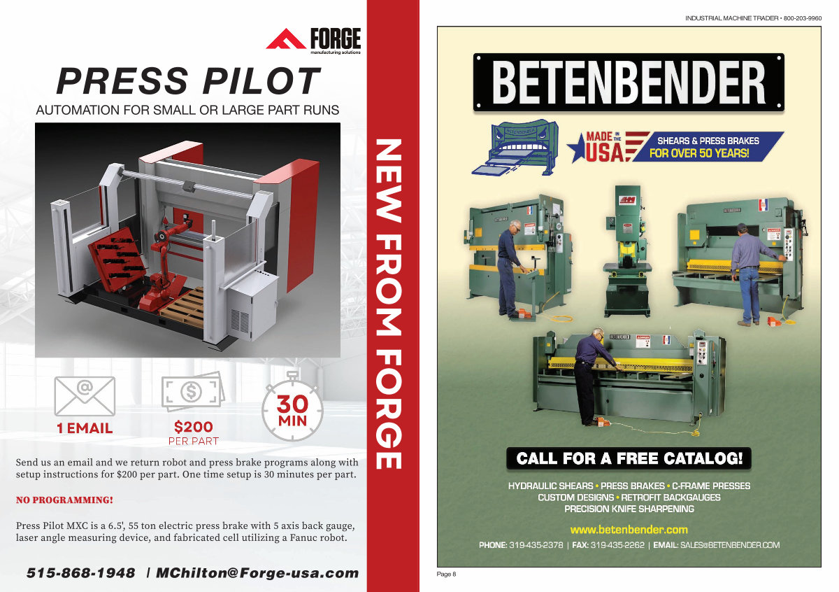 Press Pilot MXC is a 6.5 ', 55 ton electric press brake with 5 axis back gauge, laser angle measuring device, and fabricated cell utilizing a Fanuc robot.