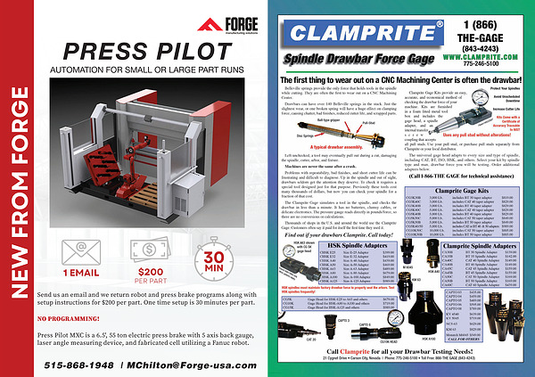Press Pilot MXC is a 6.5 ', 55 ton electric press brake with 5 axis back gauge, laser angle measuring device, and fabricated cell utilizing a Fanuc robot.