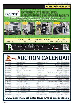 01 / 30 / 2025 Perfection Industrial Sales Online Auction Washington, MO, United States 02 / 04 / 2025 Myron Bowling Auctioneers Webcast- Online Auction Sparta, WI, United States 02 / 06 / 2025 Myron Bowling Auctioneers Webcast- Online Auction Bedford Heights, OH, United States 02 / 11 / 2025 Myron Bowling Auctioneers Timed Online Auction Mayfield, KY, United States 02 / 12 / 2025 Glenn A. Winternitz Online Auction South Chicago Heights, IL, United States 03 / 18 / 2025 Maynards Global Webcast Auction Glasgow, KY, United States www. industrialmachinetrader. com / auctions / upcoming
