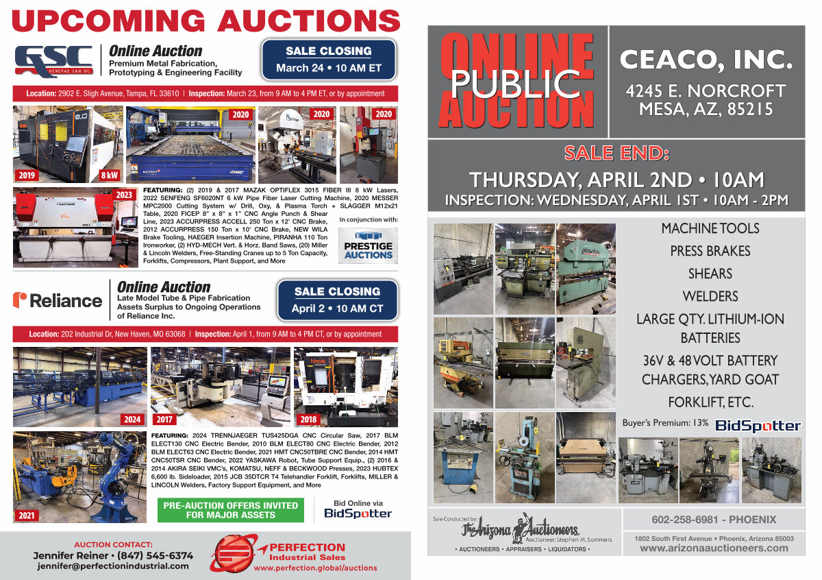 FEATURING:( 2) 2019 & 2017 MAZAK OPTIFLEX 3015 FIBER III 8 kW Lasers, 2022 SENFENG SF6020NT 6 kW Pipe Fiber Laser Cutting Machine, 2020 MESSER MPC2000 Cutting System w / Drill, Oxy, & Plasma Torch + SLAGGER M12x21 Table, 2020 FICEP 8” x 8” x 1” CNC Angle Punch & Shear Line, 2023 ACCURPRESS ACCELL 250 Ton x 12’ CNC Brake, In conjunction with: 2012 ACCURPRESS 150 Ton x 10’ CNC Brake, NEW WILA Brake Tooling, HAEGER Insertion Machine, PIRANHA 110 Ton Ironworker,( 2) HYD-MECH Vert. & Horz. Band Saws,( 20) Miller & Lincoln Welders, Free-Standing Cranes up to 5 Ton Capacity, Forklifts, Compressors, Plant Support, and More