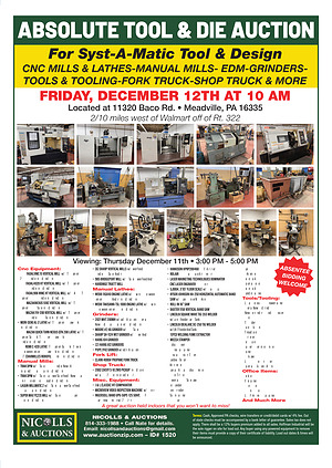 For Syst-A-Matic Tool & Design CNC MILLS & LATHES-MANUAL MILLS- EDM-GRINDERS- TOOLS & TOOLING-FORK TRUCK-SHOP TRUCK & MORE FRIDAY, DECEMBER 12TH AT 10 AM Located at 11320 Baco Rd. • Meadville, PA 16335 2 / 10 miles west of Walmart off of Rt. 322