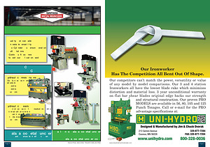 Our competitors can’ t match the power, versatility or value of any model by model comparisons. Our 3 and 4 station Ironworkers all have the lowest blade rake which minimizes distortion and material loss. 3 year unconditional warranty on flat bar shear blades original edge backs our strength and structural construction. Our proven PRO MODELS are available in 56, 80, 105 and 125 Punch Tonages. Call or e-mail for the PRO advantage specifications at: