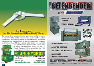 Our competitors can’ t match the power, versatility or value of any model by model comparisons. Our 3 and 4 station Ironworkers all have the lowest blade rake which minimizes distortion and material loss. 3 year unconditional warranty on flat bar shear blades original edge backs our strength and structural construction. Our proven PRO MODELS are available in 56, 80, 105 and 125 Punch Tonages. Call or e-mail for the PRO advantage specifications at: