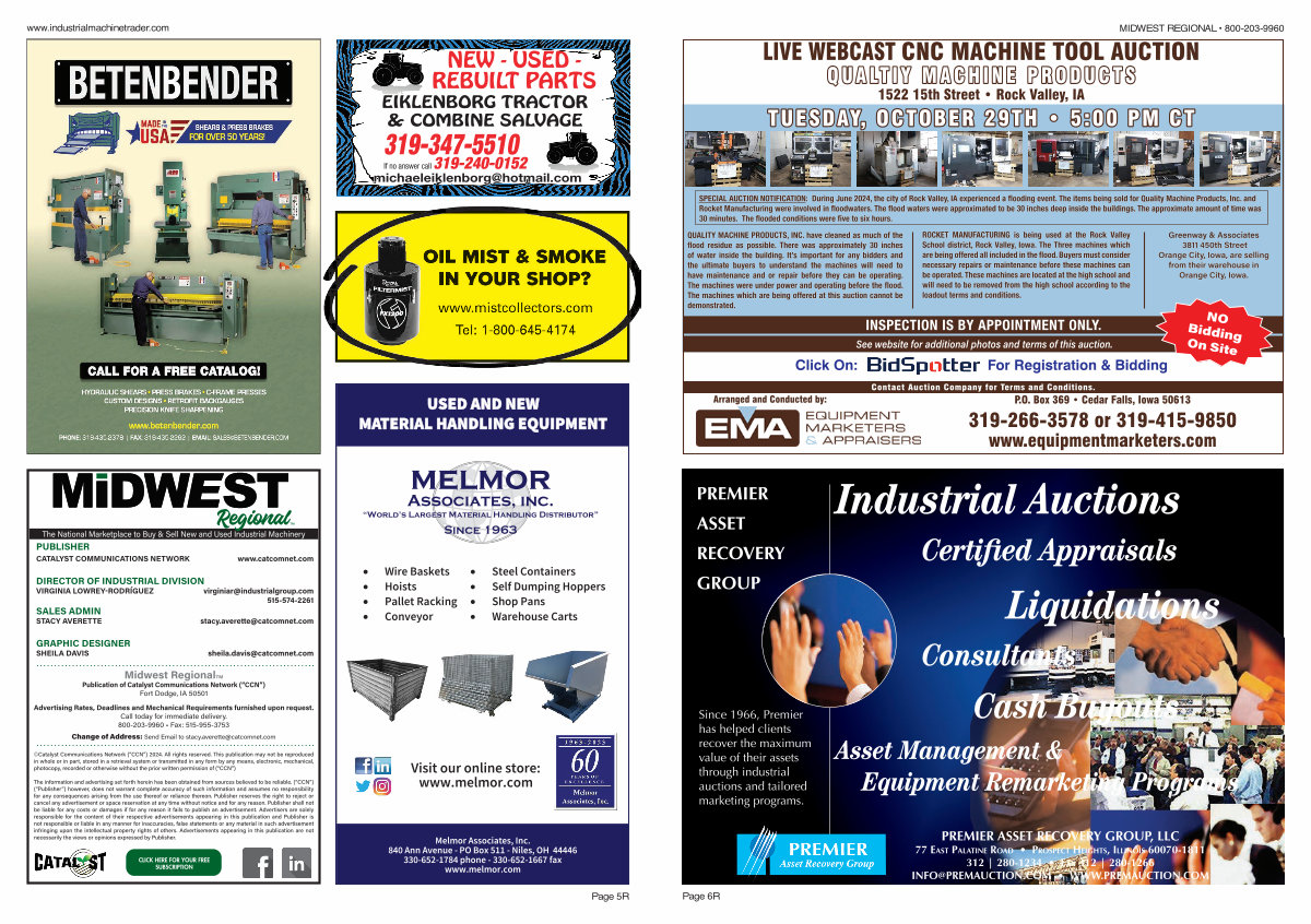SPECIAL AUCTION NOTIFICATION: During June 2024, the city of Rock Valley, IA experienced a flooding event. The items being sold for Quality Machine Products, Inc. and Rocket Manufacturing were involved in floodwaters. The flood waters were approximated to be 30 inches deep inside the buildings. The approximate amount of time was 30 minutes. The flooded conditions were five to six hours.