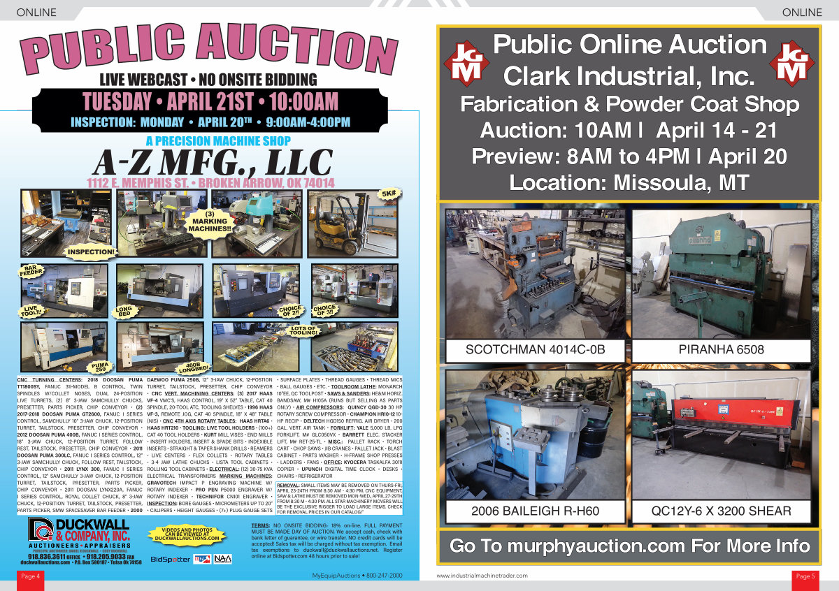 REMOVAL: SMALL ITEMS MAY BE REMOVED ON THURS-FRI, APRIL 23-24TH FROM 8:30 AM- 4:30 PM. CNC EQUIPMENT, SAW & LATHE MUST BE REMOVED MON-WED., APRIL 27-29TH FROM 8:30 M- 4:30 PM. ALL STAR MACHINERY MOVERS WILL BE THE EXCLUSIVE RIGGER TO LOAD LARGE ITEMS. CHECK FOR REMOVAL PRICES IN OUR CATALOG!”