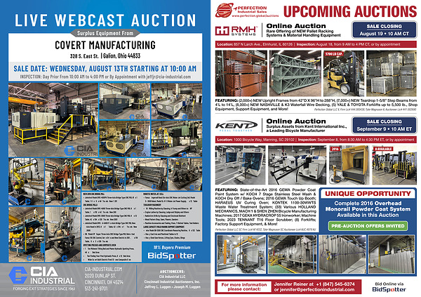 SALE DATE: WEDNESDAY, AUGUST 13TH STARTING AT 10:00 AM INSPECTION: Day Prior From 10:00 AM to 4:00 PM or By Appointment with jeffjr @ cia-industrial. com