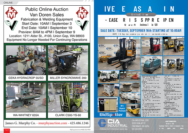 Public Online Auction Van Doren Sales Fabrication & Welding Equipment Start Date: 10AM | September 3 End Date: 10AM | September 10 Preview: 8AM to 4PM | September 9 Location: 1211 Alder St., # 100, Union Gap, WA 98903 Equipment No Longer Needed For Continuing Operations