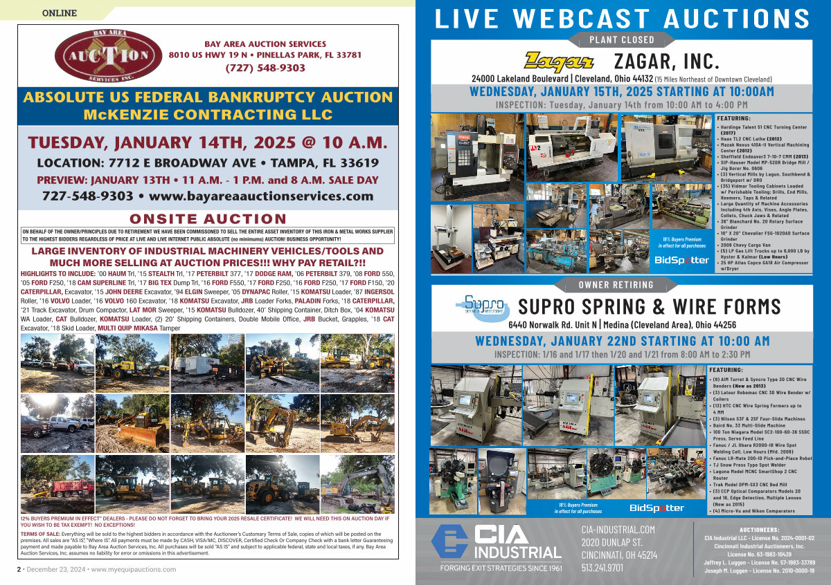 AUCTIONEERS: CIA Industrial LLC- License No. 2024-0001-02 Cincinnati Industrial Auctioneers, Inc. License No. 63-1983-10439 Jeffrey L. Luggen – License No. 57-1983-33789 Joseph M. Luggen – License No. 2010-0000-19