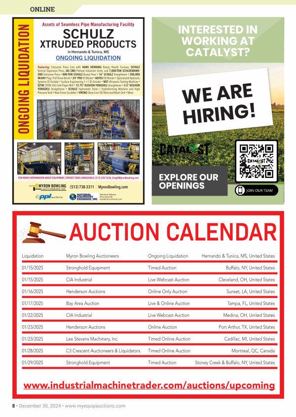 Featuring: Extrusion Press Line with HANS HENNING Rotary Hearth Furnace, SCHULZ Vertical Expansion Press, IAS SMS Preheat Induction Units, and 7,000-TON SCHLOEMANN- SMS Extrusion Press • 800-TON SCHULZ Bump Press • 16” SCHULZ Straightener • 200, 000 McKAY Plug / Pull Draw Bench • 24” PRD ID Blaster • AGTOS OD Blaster • Specialized Hydraulic Systems ID Grinder • Surface Engineering 1 + 1 ID Grinder • NDT Ultrasonic Testing Machine • EZTM CRTM 350 Cold Pilger Mill • 12. 75” KUSHON YONGDELI Straightener • 5. 5” KUSHON YONGDELI Straightener • SCHULZ Hydrostatic Tester / Hydroforming Machine and High Pressure Tank • New Fume Scrubber • VIKING Skew-Line OD Blast and Wash Unit • More
