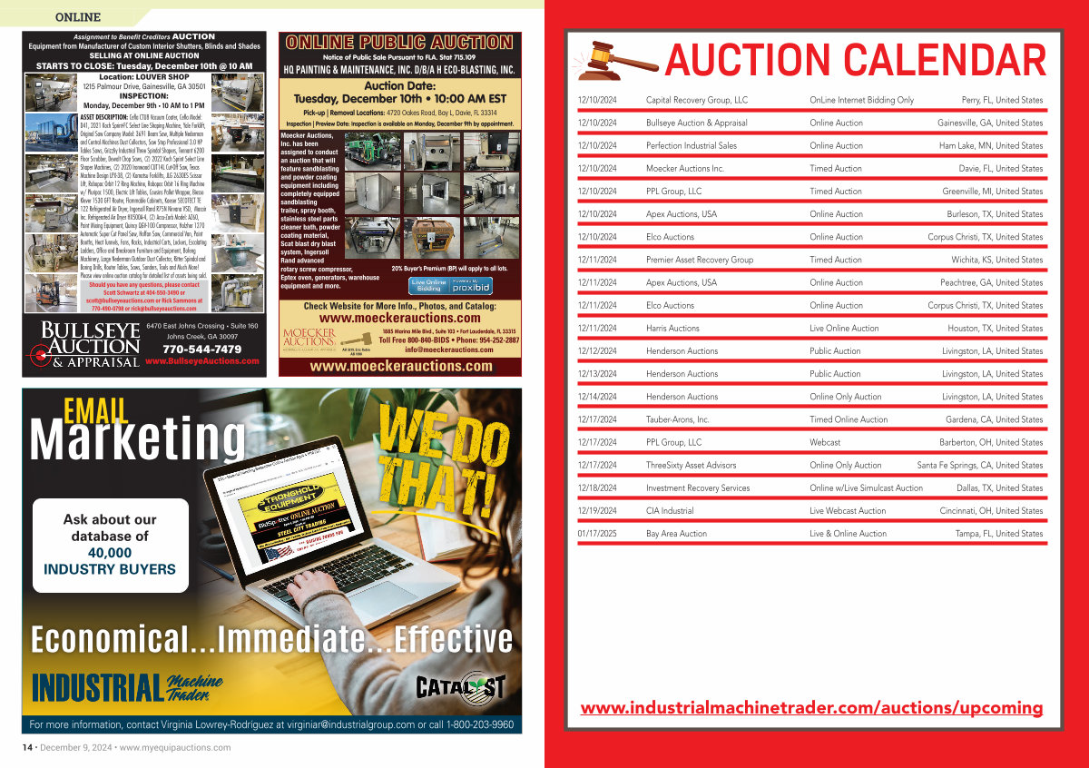 Inc. has been assigned to conduct an auction that will feature sandblasting and powder coating equipment including completely equipped sandblasting trailer, spray booth, stainless steel parts cleaner bath, powder coating material,