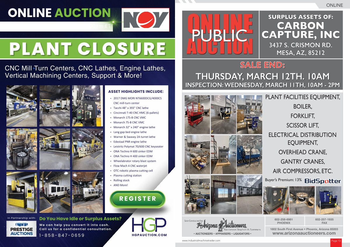 2017 DMG MORI NT6600DCG / 4000CS CNC mill-turn center Tacchi 48 " x 393 " CNC lathe Cincinnati T-40 CNC HMC( 6-pallets) Monarch 175-B CNC VMC Monarch 75-B CNC VMC Monarch 32 " x 240 " engine lathe Lang gap bed engine lathe Warner & Swasey 2A turret lathe Edestaal PNR engine lathe Leistritz Polymat 70 / 600 CNC keyseater ONA Techno H 600 sinker EDM ONA Techno H 400 sinker EDM Wheelabrator rotary blast system Flow Mach 4 CNC waterjet OTC robotic plasma cutting cell Plasma cutting station Rolling stock AND More!