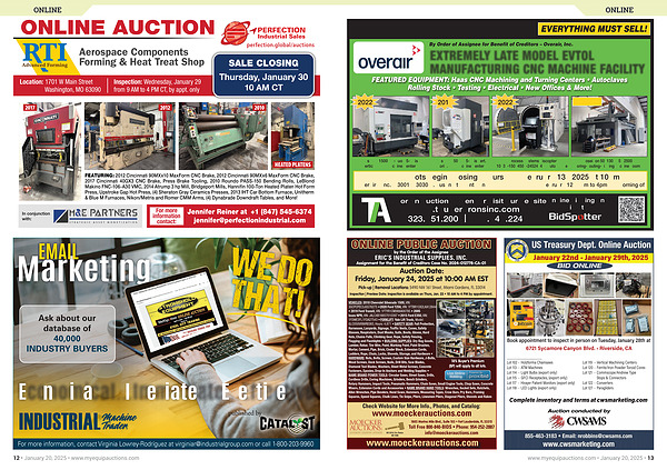 FEATURING: 2012 Cincinnati 90MXx10 MaxForm CNC Brake, 2012 Cincinnati 90MXx6 MaxForm CNC Brake, 2017 Cincinnati 40GX3 CNC Brake, Press Brake Tooling, 2010 Roundo PASS-150 Bending Rolls, LeBlond Makino FNC-106-A30 VMC, 2014 Atrump 3 hp Mill, Bridgeport Mills, Hannifin 100-Ton Heated Platen Hot Form Press, Upstroke Gap Hot Press,( 4) Sheraton Gray Ceramics Presses, 2013 IHT Car Bottom Furnace, Unitherm & Blue M Furnaces, Nikon / Metris and Romer CMM Arms,( 4) Dynabrade Downdraft Tables, and More!