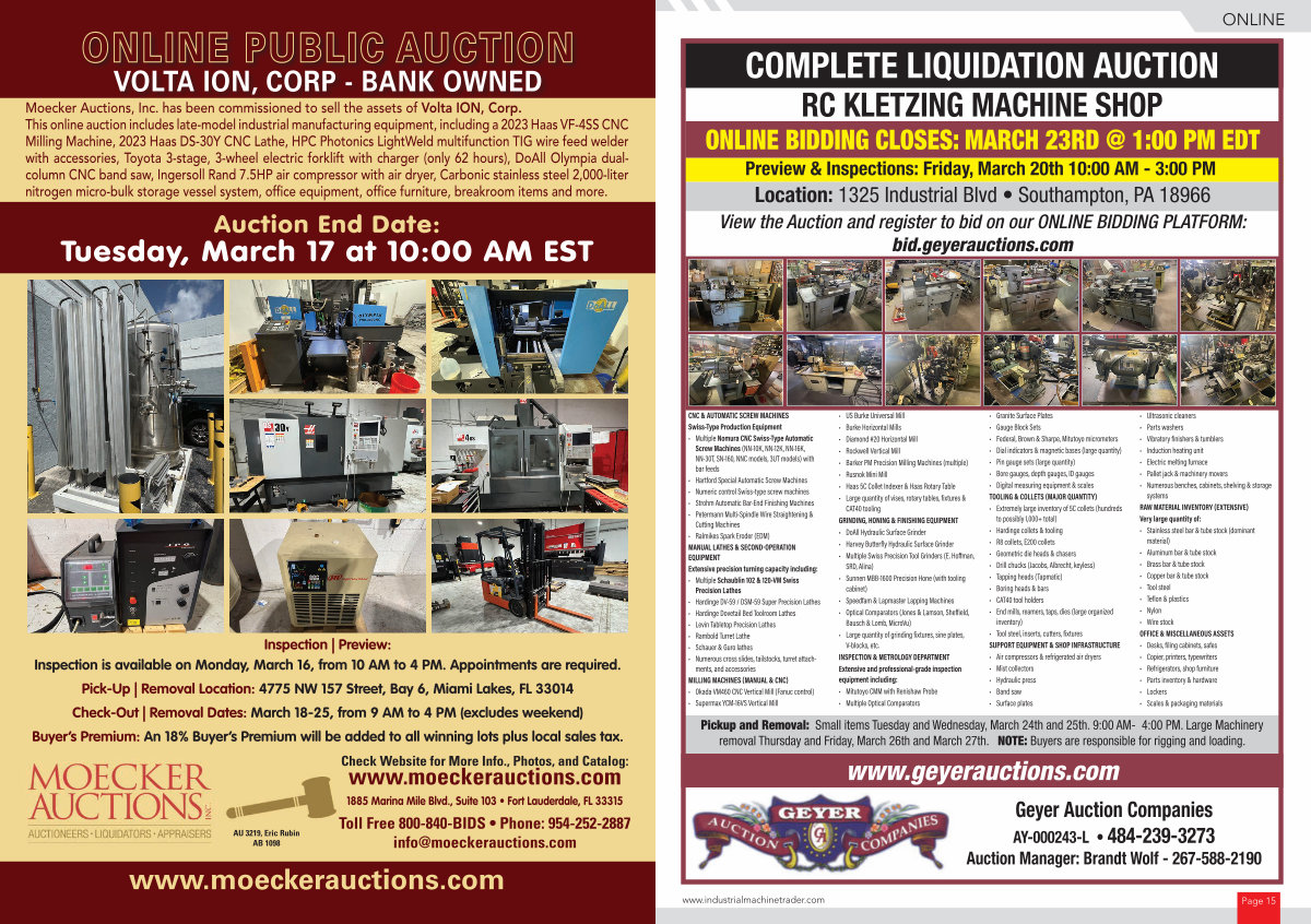 Moecker Auctions, Inc. has been commissioned to sell the assets of Volta ION, Corp. This online auction includes late-model industrial manufacturing equipment, including a 2023 Haas VF-4SS CNC Milling Machine, 2023 Haas DS-30Y CNC Lathe, HPC Photonics LightWeld multifunction TIG wire feed welder with accessories, Toyota 3-stage, 3-wheel electric forklift with charger( only 62 hours), DoAll Olympia dualcolumn CNC band saw, Ingersoll Rand 7.5HP air compressor with air dryer, Carbonic stainless steel 2,000-liter nitrogen micro-bulk storage vessel system, office equipment, office furniture, breakroom items and more.