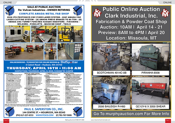 Public Online Auction Clark Industrial, Inc. Fabrication & Powder Coat Shop Auction: 10AM | April 14- 21 Preview: 8AM to 4PM | April 20 Location: Missoula, MT