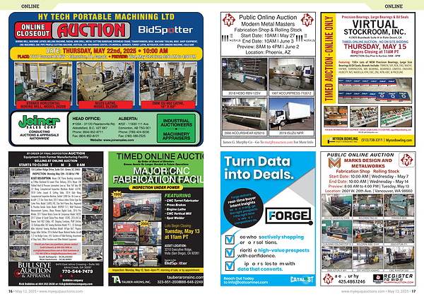 BORING MILL, MACHINE LATHES, MILLING MACHINE, RADIAL ARM DRILL, METAL CUTTING BANDSAW, OVERHEAD CRANE, TRANSFORMERS, MISC. MACHINE TOOLING, MISC. SHOP EQUIPMENT, CNC MACHINES, CNC PIPE PROFILE CUTTING MACHINE, VERTICAL CNC MACHINING CENTER, CYLINDRICAL GRINDER, TURRET LATHE, KEYSEATER, EDM SINKERS MACHINE, COLD SAW DATE: THURSDAY, MAY 22nd, 2025 • 10:00 AM