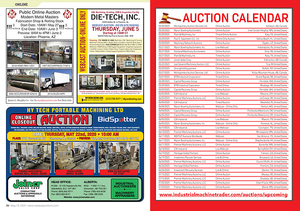 BORING MILL, MACHINE LATHES, MILLING MACHINE, RADIAL ARM DRILL, METAL CUTTING BANDSAW, OVERHEAD CRANE, TRANSFORMERS, MISC. MACHINE TOOLING, MISC. SHOP EQUIPMENT, CNC MACHINES, CNC PIPE PROFILE CUTTING MACHINE, VERTICAL CNC MACHINING CENTER, CYLINDRICAL GRINDER, TURRET LATHE, KEYSEATER, EDM SINKERS MACHINE, COLD SAW DATE: THURSDAY, MAY 22nd, 2025 • 10:00 AM