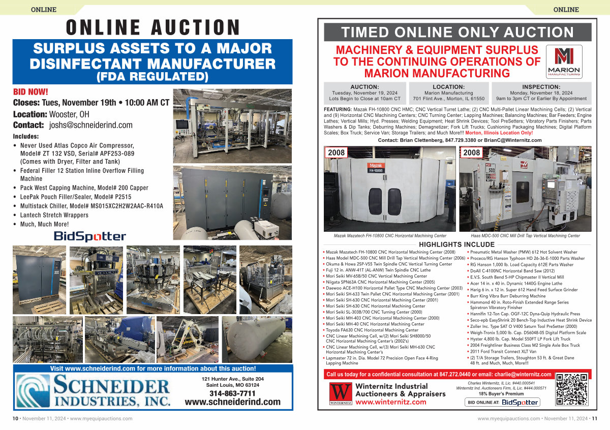 FEATURING: Mazak FH-10800 CNC HMC; CNC Vertical Turret Lathe;( 2) CNC Multi-Pallet Linear Machining Cells;( 2) Vertical and( 9) Horizontal CNC Machining Centers; CNC Turning Center; Lapping Machines; Balancing Machines; Bar Feeders; Engine Lathes; Vertical Mills; Hyd. Presses; Welding Equipment; Heat Shrink Devices; Tool PreSetters; Vibratory Parts Finishers; Parts Washers & Dip Tanks; Deburring Machines; Demagnetizer; Fork Lift Trucks; Cushioning Packaging Machines; Digital Platform Scales; Box Truck; Service Van; Storage Trailers; and Much More!!! Morton, Illinois Location Only!