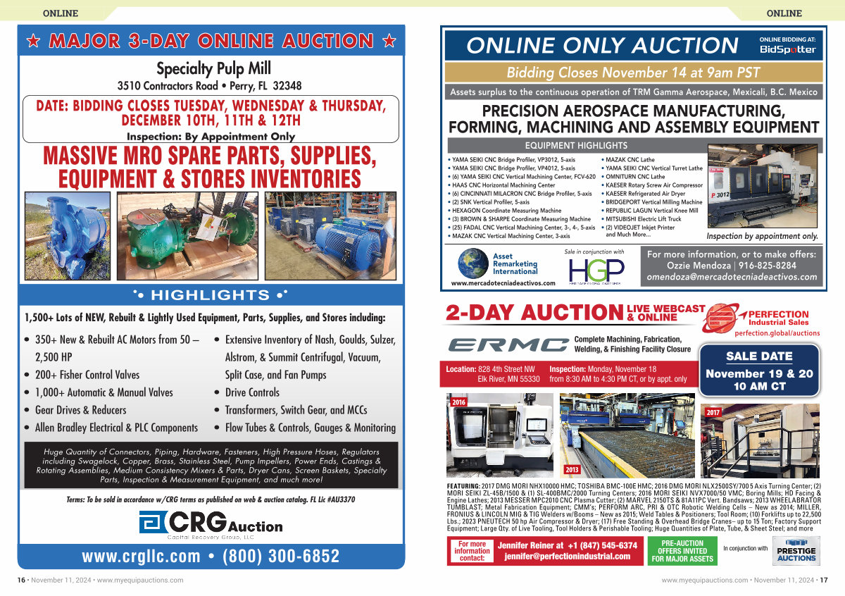 FEATURING: 2017 DMG MORI NHX10000 HMC; TOSHIBA BMC-100E HMC; 2016 DMG MORI NLX2500SY / 700 5 Axis Turning Center;( 2) MORI SEIKI ZL-45B / 1500 &( 1) SL-400BMC / 2000 Turning Centers; 2016 MORI SEIKI NVX7000 / 50 VMC; Boring Mills; HD Facing & Engine Lathes; 2013 MESSER MPC2010 CNC Plasma Cutter;( 2) MARVEL 2150TS & 81A11PC Vert. Bandsaws; 2013 WHEELABRATOR TUMBLAST; Metal Fabrication Equipment; CMM’ s; PERFORM ARC, PRI & OTC Robotic Welding Cells – New as 2014; MILLER, FRONIUS & LINCOLN MIG & TIG Welders w / Booms – New as 2015; Weld Tables & Positioners; Tool Room;( 10) Forklifts up to 22,500 Lbs.; 2023 PNEUTECH 50 hp Air Compressor & Dryer;( 17) Free Standing & Overhead Bridge Cranes – up to 15 Ton; Factory Support Equipment; Large Qty. of Live Tooling, Tool Holders & Perishable Tooling; Huge Quantities of Plate, Tube, & Sheet Steel; and more