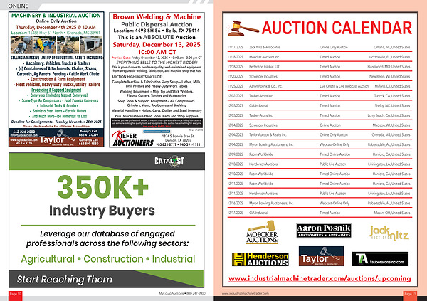 Saturday, December 13, 2025 10:00 AM CT Preview Date: Friday, December 12, 2025 • 10:00 am- 3:00 pm CT EVERYTHING SELLS TO THE HIGHEST BIDDER! This is your chance to purchase quality, well-maintained equipment from a reputable welding, fabrication, and machine shop that has