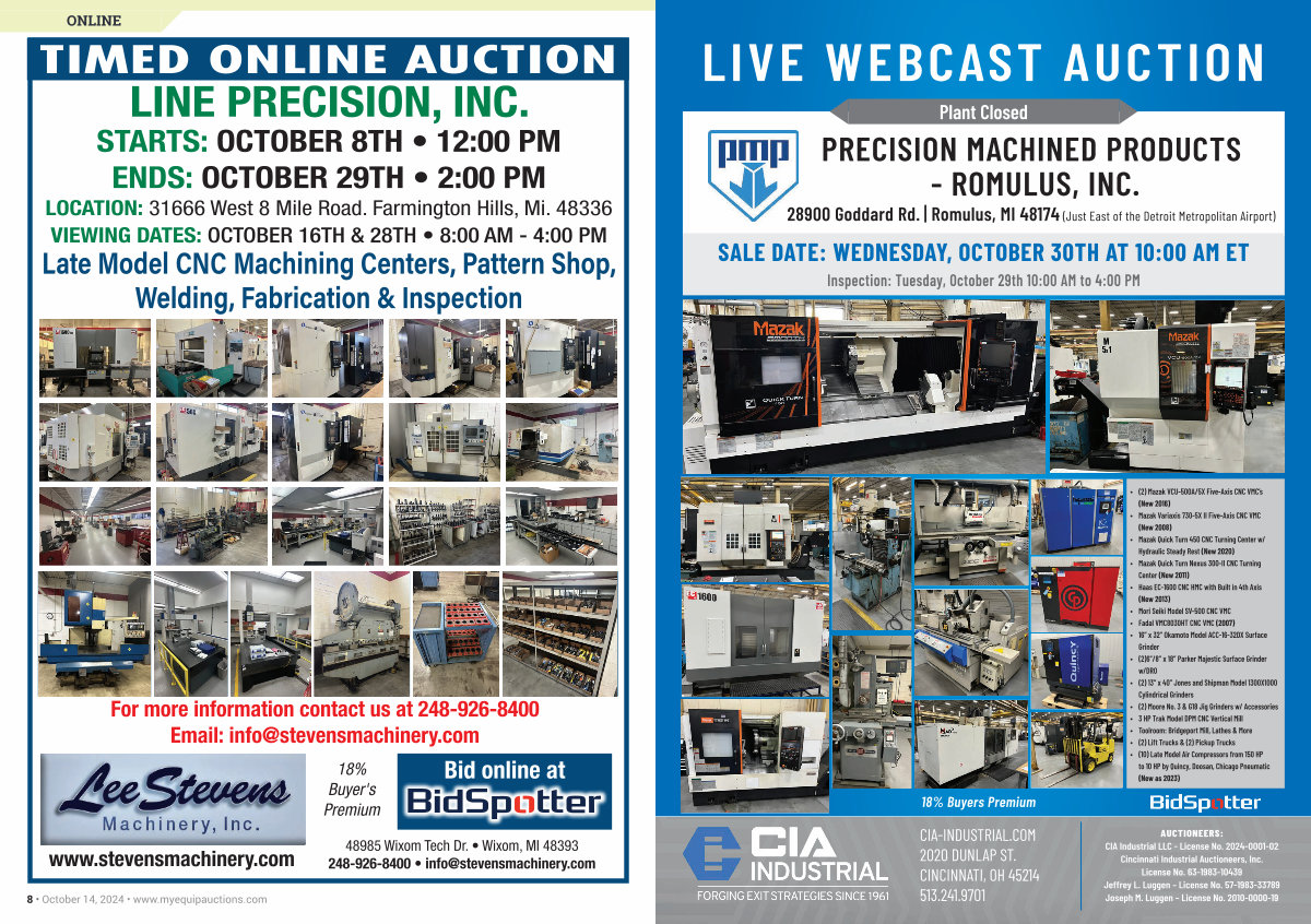 TIMED ONLINE AUCTION LINE PRECISION, INC. STARTS: OCTOBER 8TH • 12:00 PM ENDS: OCTOBER 29TH • 2:00 PM LOCATION: 31666 West 8 Mile Road. Farmington Hills, Mi. 48336