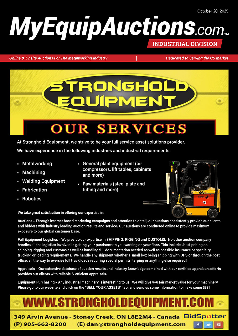 Equipment Purchasing – Any industrial machinery is interesting to us! We will give you fair market value for your machinery. Please go to our website and click on the“ SELL YOUR ASSETS” tab, and send us some information to make some $$$! www. strongholdequipment. com dan @ strongholdequipment. com