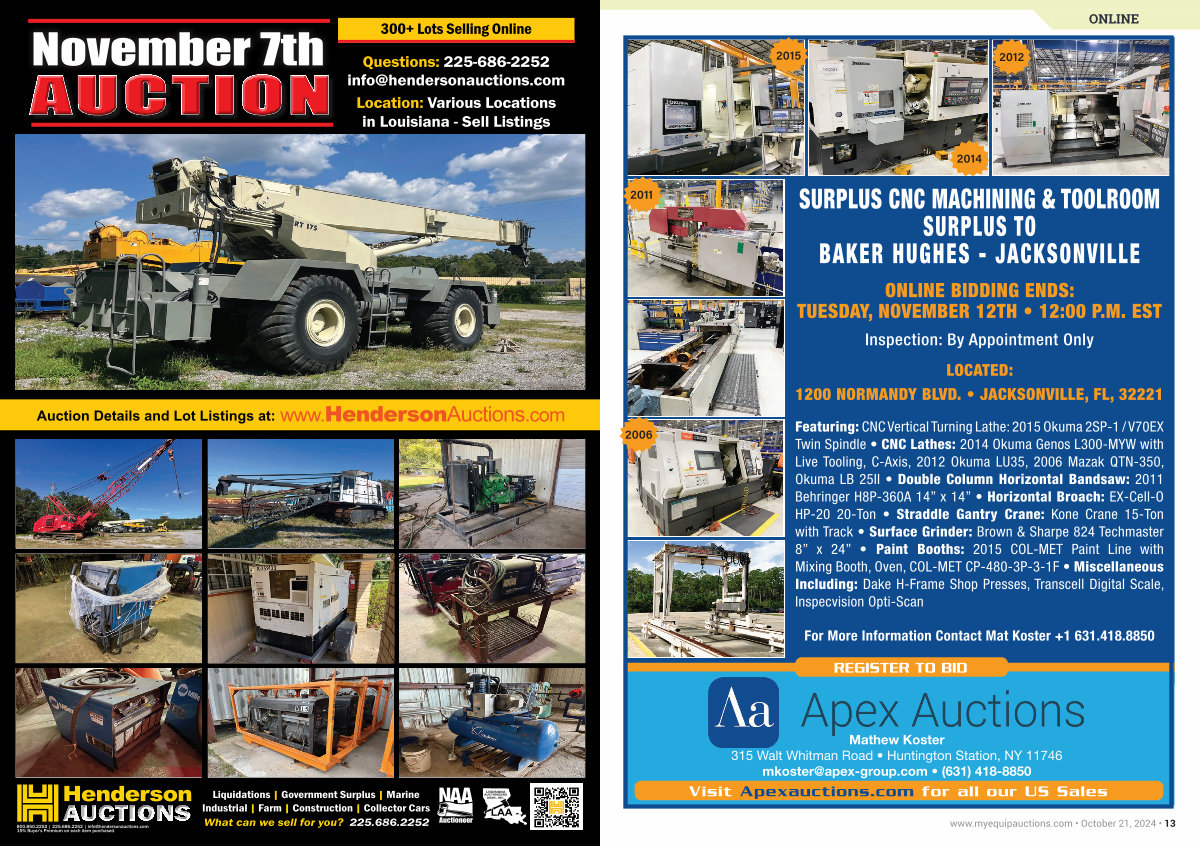 Featuring: CNC Vertical Turning Lathe: 2015 Okuma 2SP-1 / V70EX Twin Spindle • CNC Lathes: 2014 Okuma Genos L300-MYW with Live Tooling, C-Axis, 2012 Okuma LU35, 2006 Mazak QTN-350, Okuma LB 25II • Double Column Horizontal Bandsaw: 2011 Behringer H8P-360A 14” x 14” • Horizontal Broach: EX-Cell-O HP-20 20-Ton • Straddle Gantry Crane: Kone Crane 15-Ton with Track • Surface Grinder: Brown & Sharpe 824 Techmaster 8” x 24” • Paint Booths: 2015 COL-MET Paint Line with Mixing Booth, Oven, COL-MET CP-480-3P-3-1F • Miscellaneous Including: Dake H-Frame Shop Presses, Transcell Digital Scale, Inspecvision Opti-Scan