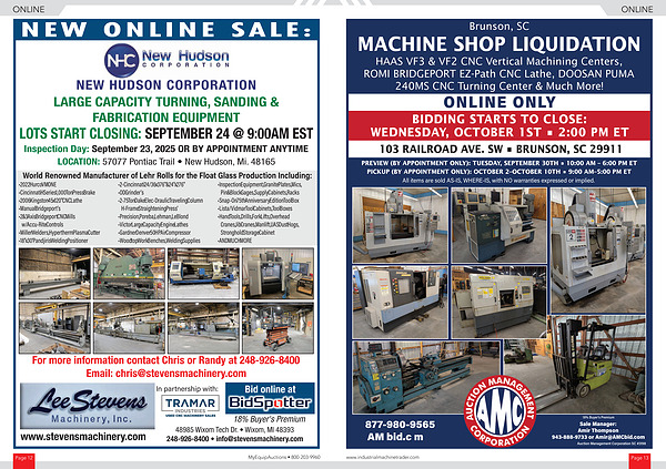NEW HUDSON CORPORATION LARGE CAPACITY TURNING, SANDING & FABRICATION EQUIPMENT LOTS START CLOSING: SEPTEMBER 24 @ 9:00AM EST