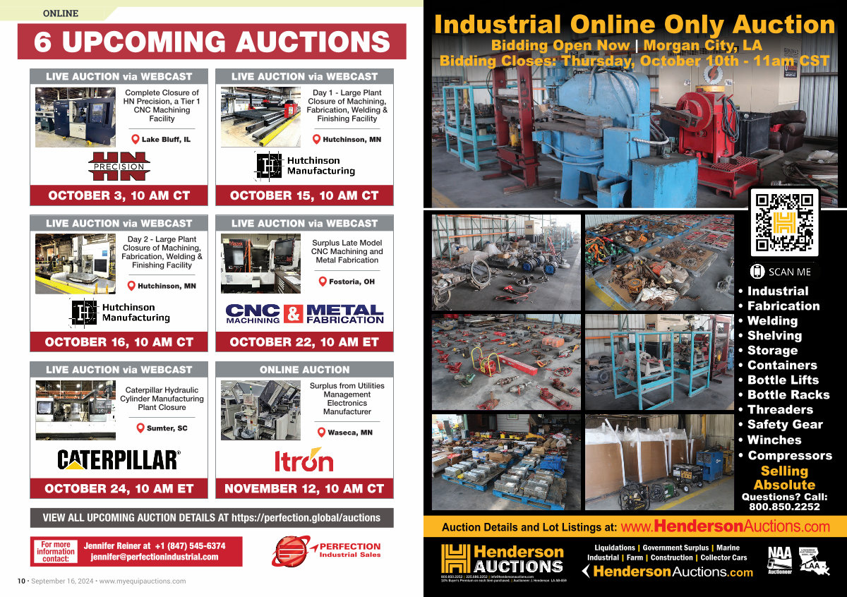 800.850.2252 | 225.686.2252 | info @ hendersonauctions. com 10 % Buyer’ s Premium on each item purchased. | Auctioneer: J. Henderson LA AB-459 www. myequipauctions. com • September 16, 2024 • 11