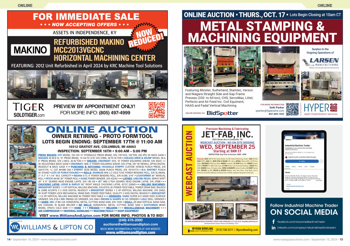 Featuring Minster, Sutherland, Stamtec, Verson and Niagara Straight Side and Gap Frame Presses( 330- to 60-ton), CHS, ServoMax, Littel, Perfecto and Air Feed Inc. Coil Equiment, HAAS and Fadal Vertical Machining